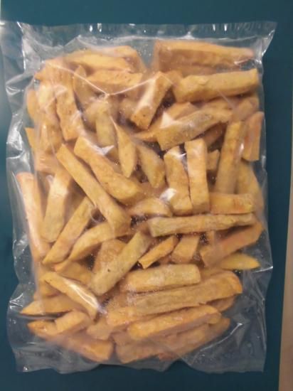 【商品説明】:太切りカットしまた安納芋のプリフライ冷凍品。フライヤー、オーブン等で加熱してお召し上がりください。